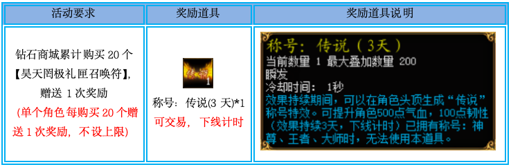 例如:玩家A在钻石商城购买了100个【昊天罔极礼匣召唤符】,则可以获得5个可交易的“称号:传说(3天)”的奖励;