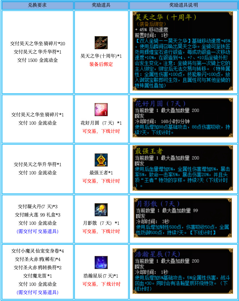 活动期间,可在NPC“藏宝阁阁主”处兑换以下各类道具: