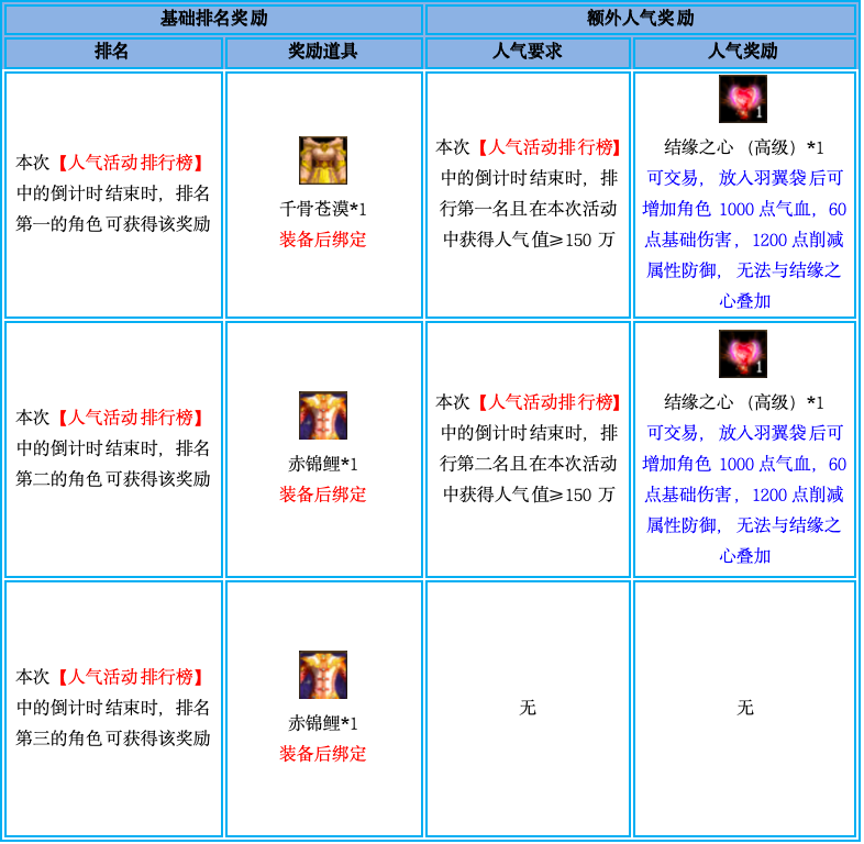 2、本活动开启前,角色已经获得的人气值不会计算在内,必须要在活动开启后获得的人气值才为有效;
